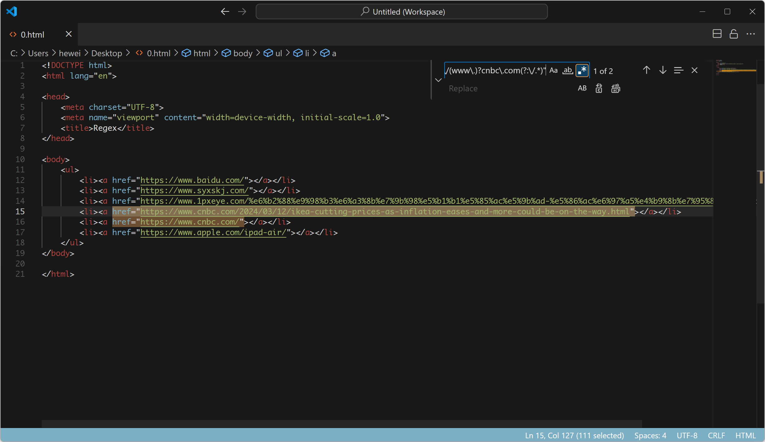 在代码编辑器中通过正则表达式选中href中包含cnbc.com的链接: