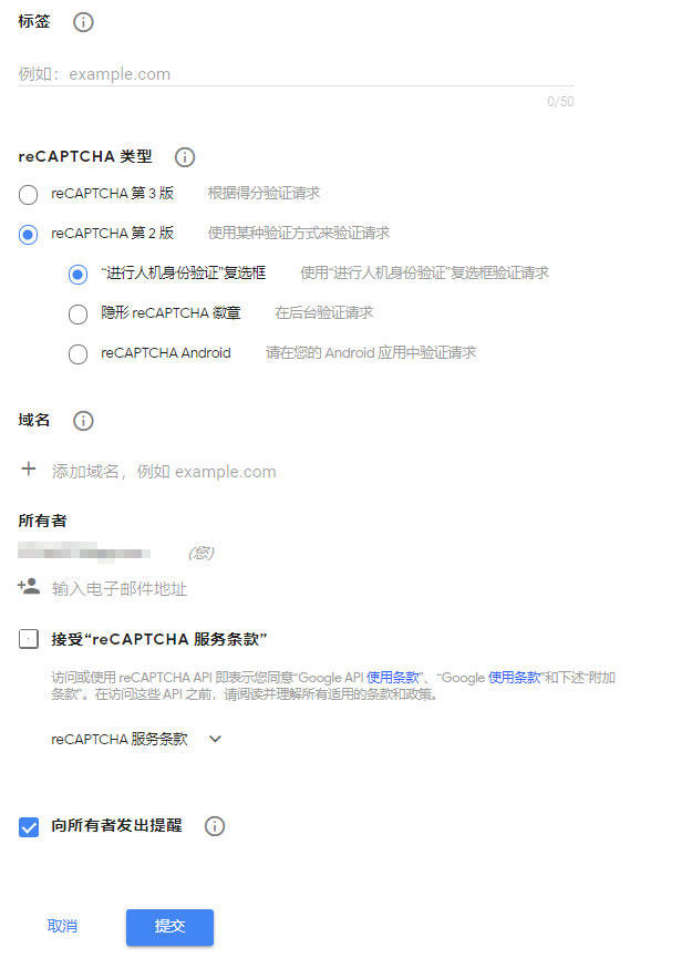 首先需要一个谷歌账号,点击以下链接进入谷歌reCAPTCHA https://www.google.com/recaptcha/admin/create 配置填写标签域名选择第二版就行,如下图: