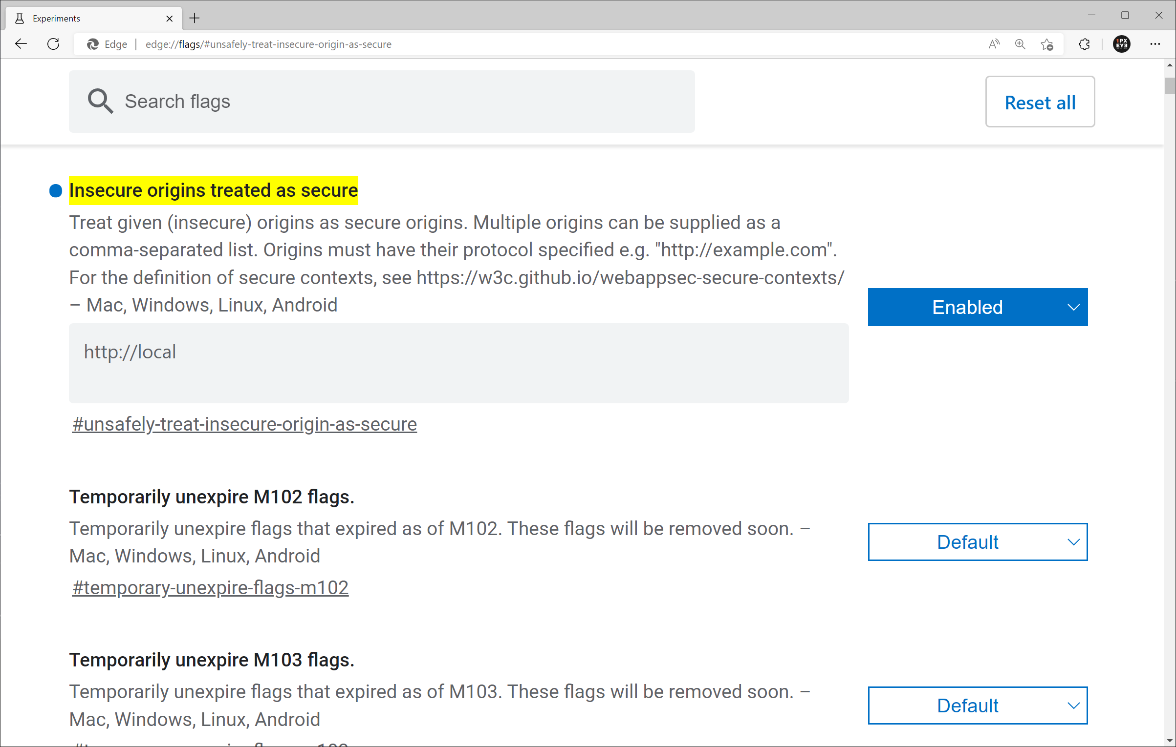 浏览器里打开chrome://flags。启用配置“Insecure origins treated as secure”。(或者直接打开:edge://flags/#unsafely-treat-insecure-origin-as-secure)并将测试网址添加到白名单里。