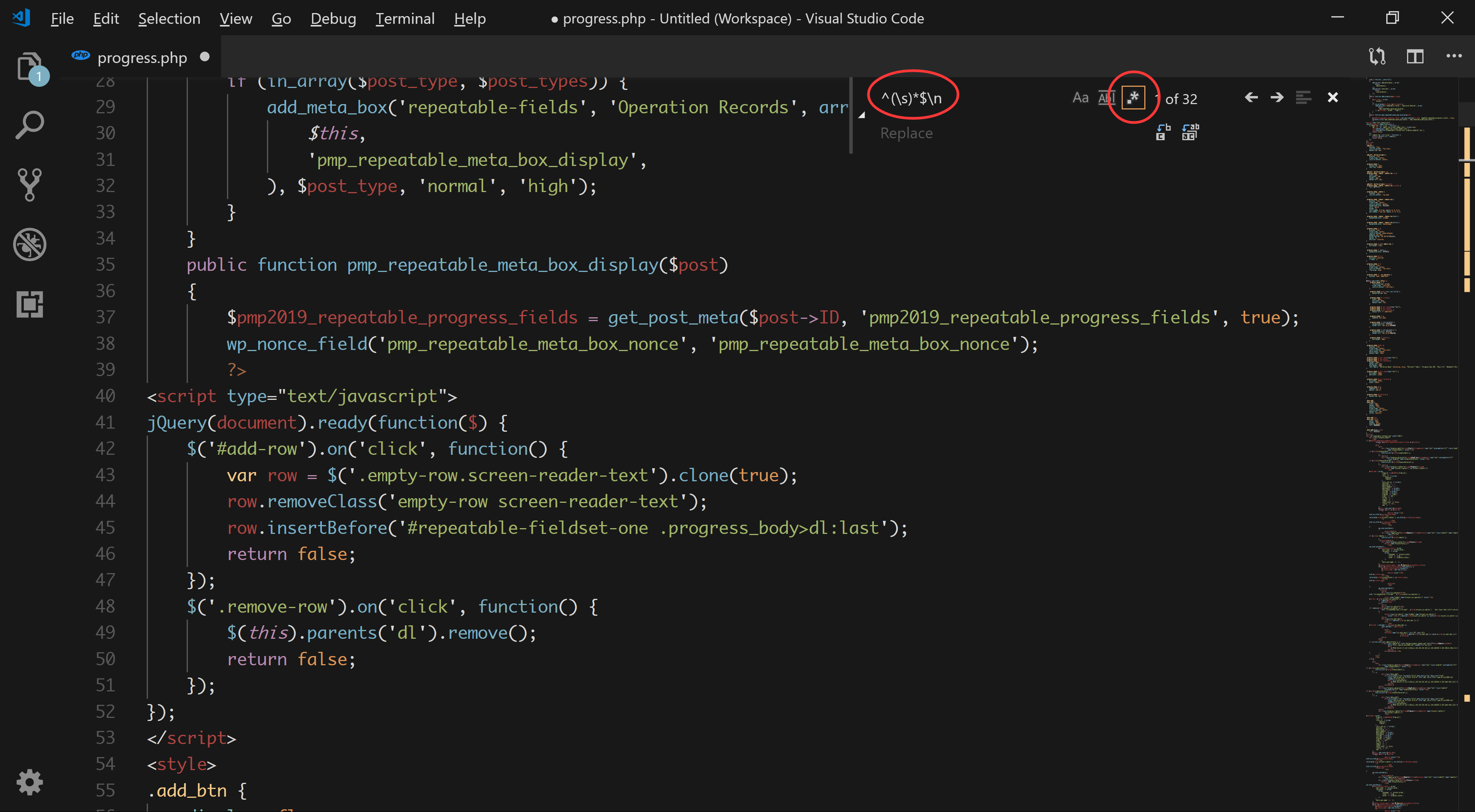 在VS Code编辑器中调出查找替换工具(Ctrl+H)。工具中点击正则表达式按钮。接着输入正则表达式: